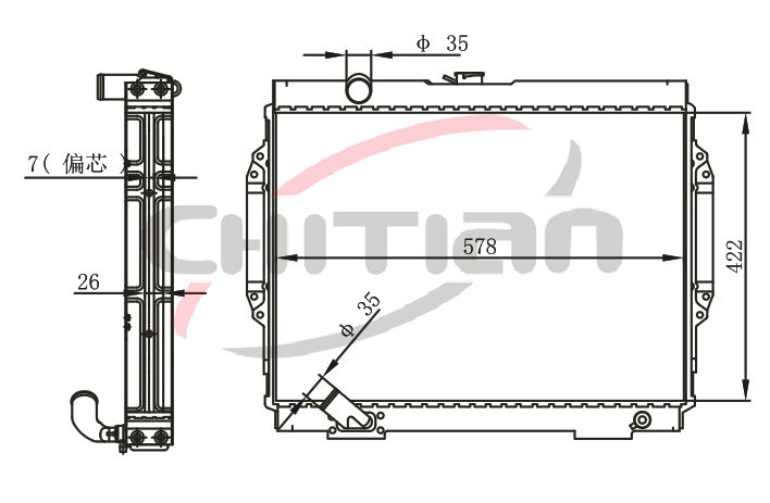 Name: RadiatorPart No.: CT-MB108Remark: Depth (mm):26Length (mm):578Transmission ():MTWidth (mm):422OEM Number