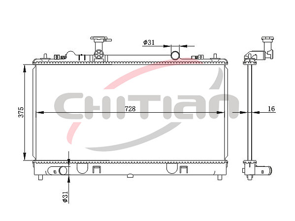 Name: RadiatorPart No.: CT-MZ081Remark: Depth (mm):16Length (mm):728Transmission ():MTWidth (mm):375OEM Number