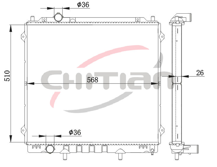 Name: RadiatorPart No.: CT-HY088Remark: Depth (mm):26Length (mm):568Transmission ():MTWidth (mm):510OEM Number