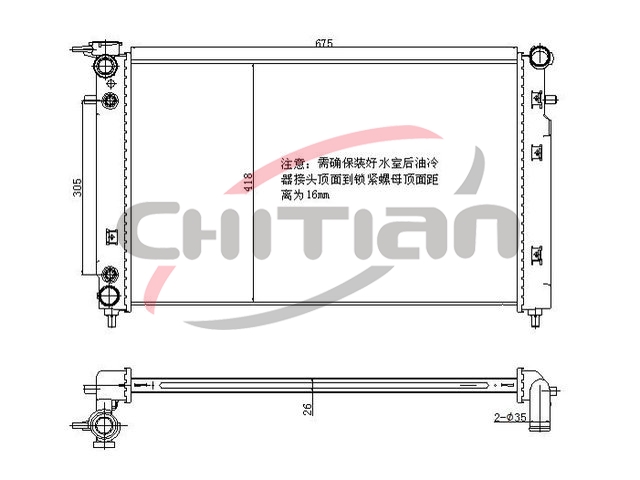 Name: 散热器Part No.: CT-HL042Remark: 变速箱 ():AT长度 (mm):675厚度 (mm):26宽度 (mm):428OEM Number