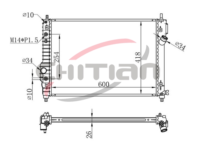 Name: RadiatorPart No.: CT-DW038Remark: Depth (mm):26Length (mm):600Transmission ():ATWidth (mm):418OEM Number