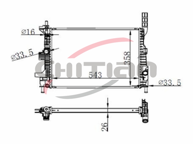 Name: RadiatorPart No.: CT-FD077Remark: Depth (mm):26Length (mm):543Transmission ():MTWidth (mm):358OEM Number