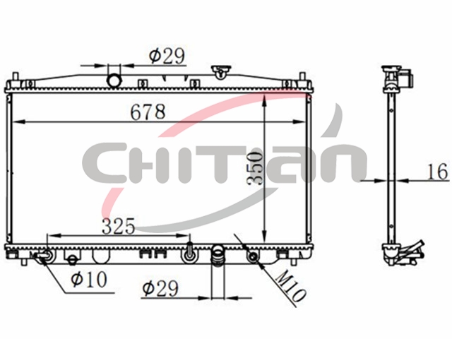 Name: RadiatorPart No.: CT-HD137Remark: Depth (mm):16Length (mm):678Transmission ():ATWidth (mm):350OEM Number
