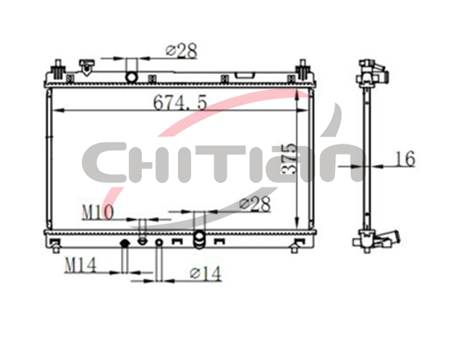 Name: RadiatorPart No.: CT-HD173Remark: Depth (mm):16Length (mm):668Transmission ():MTWidth (mm):375OEM Number