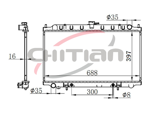 Name: RadiatorPart No.: CT-NS086Remark: Depth (mm):16Length (mm):688Transmission ():ATWidth (mm):397OEM Number